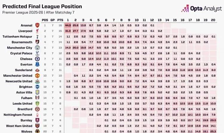数据机构OPTA的超等盘算推算机展望,本赛季英超冠军的可能性如下: